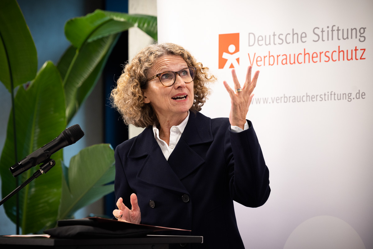 Luise Will, Geschäftsführerin der Deutschen Stiftung Verbraucherschutz eröffnete die Dialogveranstaltung mit dem klaren Anliegen der Stiftung „Es gilt, alle Perspektiven zusammenzubringen, damit für Verbraucher:innen aus einem „nachhaltig konsumieren wollen‘ auch ein ‚ nachhaltig konsumieren können‘ wird“.