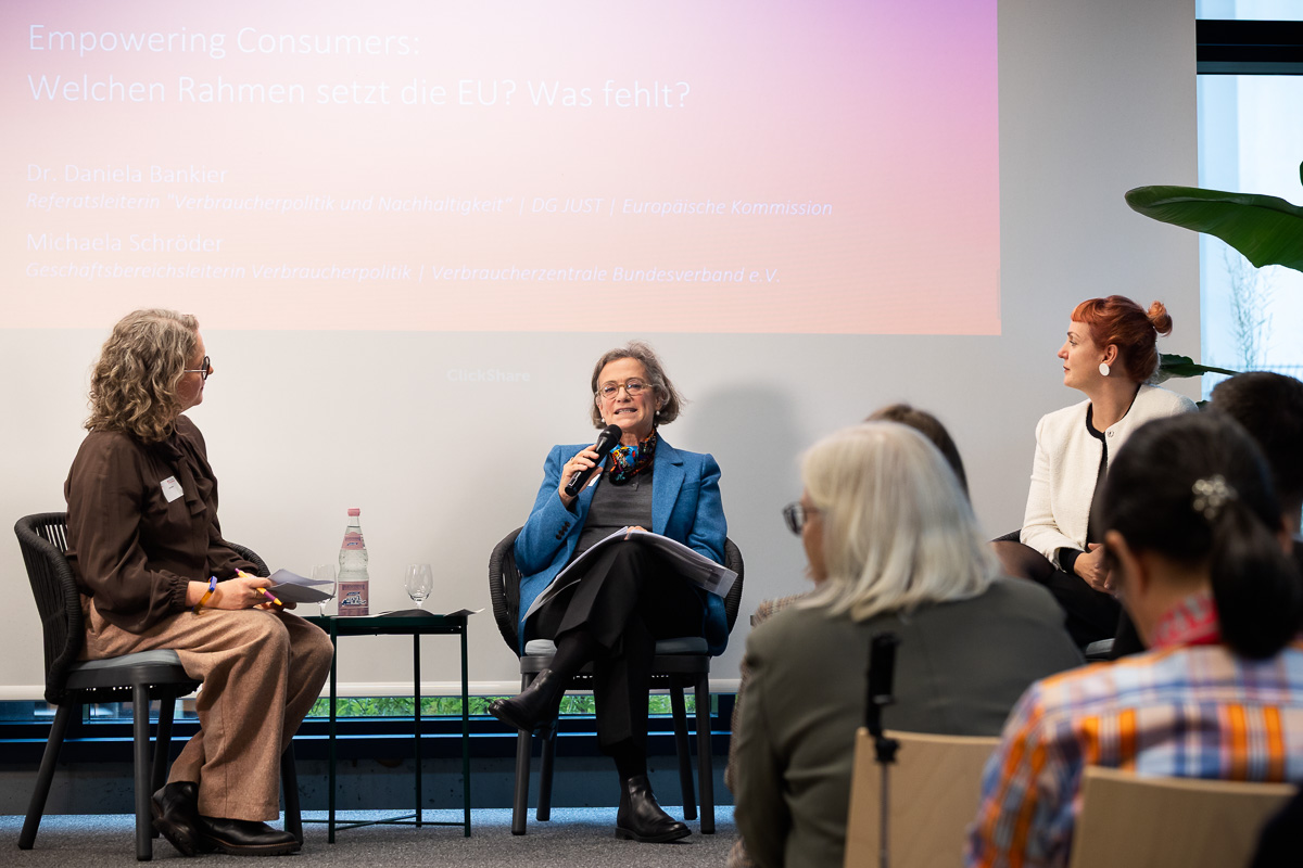 Im Gespräch über die EU-Richtlinie „Empowering Consumers for the Green Transition“ betonte Dr. Daniela Bankier (Europäische Kommission) die Bedeutung klarer Regeln für mehr Transparenz und Verbraucherinformation im nachhaltigen Konsum. Michaela Schröder (Verbraucherzentrale Bundesverband e.V.) begrüßte die Fortschritte auf EU-Ebene, wies jedoch darauf hin, dass ohne die begleitende Green-Claims-Richtlinie zentrale Schutzmechanismen gegen Greenwashing weiterhin fehlen. Beide waren sich einig, dass Verbraucher:innen nicht allein durch Verantwortung, sondern durch verlässliche Rahmenbedingungen befähigt werden müssen, nachhaltige Kaufentscheidungen zu treffen.